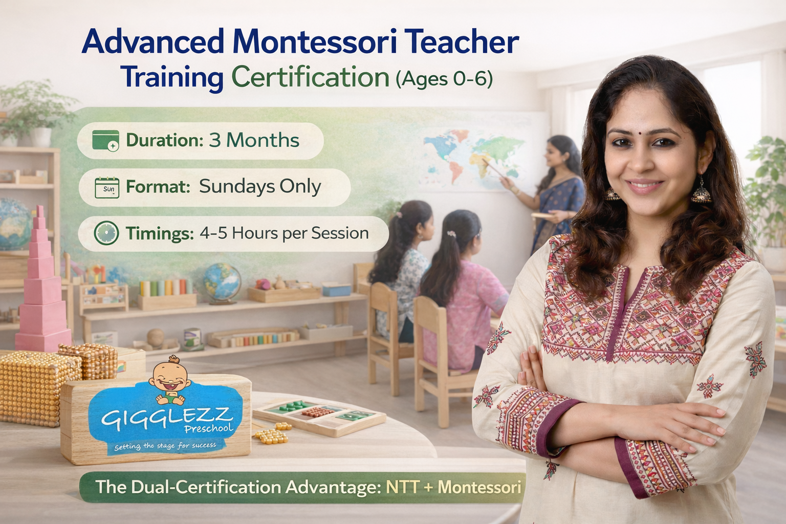By combining your Nursery Teacher Training (NTT) with an Advanced Montessori Certification, you achieve a Dual-Certified Status that sets you apart from 90% of job applicants.